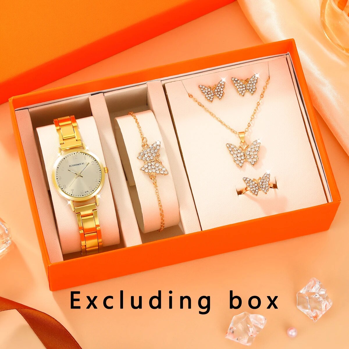 The set arrived within a week, and I couldn't wait to open it. My first impression was excellent. The packaging was neat, and every piece looked far more expensive than its actual cost. The ring featured a lovely rhinestone design with Roman numeral details that I found very chic. The watch face was elegant, and the butterfly necklace and bracelet added a playful touch. While it's not made of solid gold, the appearance is convincingly golden.